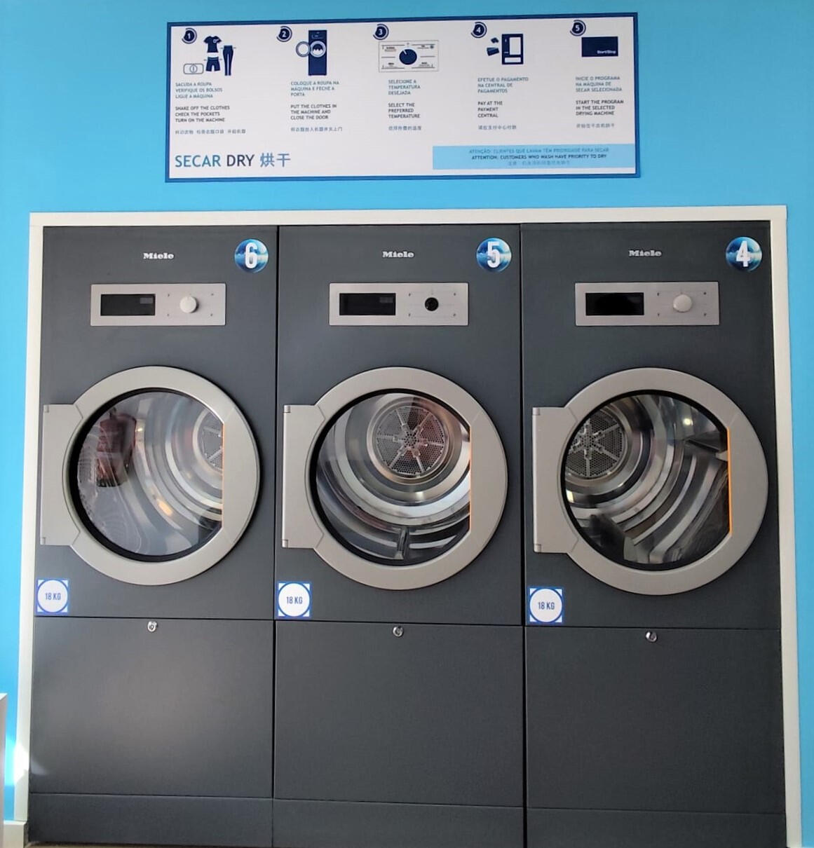 While the washing/drying process is taking place, the machines do not open, which means that customers don't run the risk of third parties accessing their contents.We have the following equipment:* 1 - 8 kg washing machine